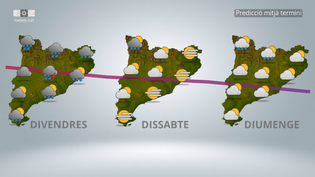 En aquest sentit, divendres serà un dia que a banda de començar molt ventat a cotes altes, ens creuarà un front. Jornada, doncs, força adversa al matí, sobretot al Pirineu i Prepirineu, per la mala visibilitat a cotes mitjanes i altes, precipitació (cota de neu dels 2.600 m davallant als 2.400 m) i el vent que comentàvem. Passat el front, de cara a la segona meitat del dia, davallarà la temperatura, però els registres encara quedaran per sobre del que toca en aquestes dates, ja que vindrem de molt amunt. A banda, el pas de la línia frontal portarà més inestabilitat, i per aquesta raó, de cara a la tarda, i sobretot als massissos del litoral i prelitoral, es poden produir xàfecs, fins i tot amb tempesta. En general, divendres, les pitjors condicions seran als massissos de la meitat nord i est.