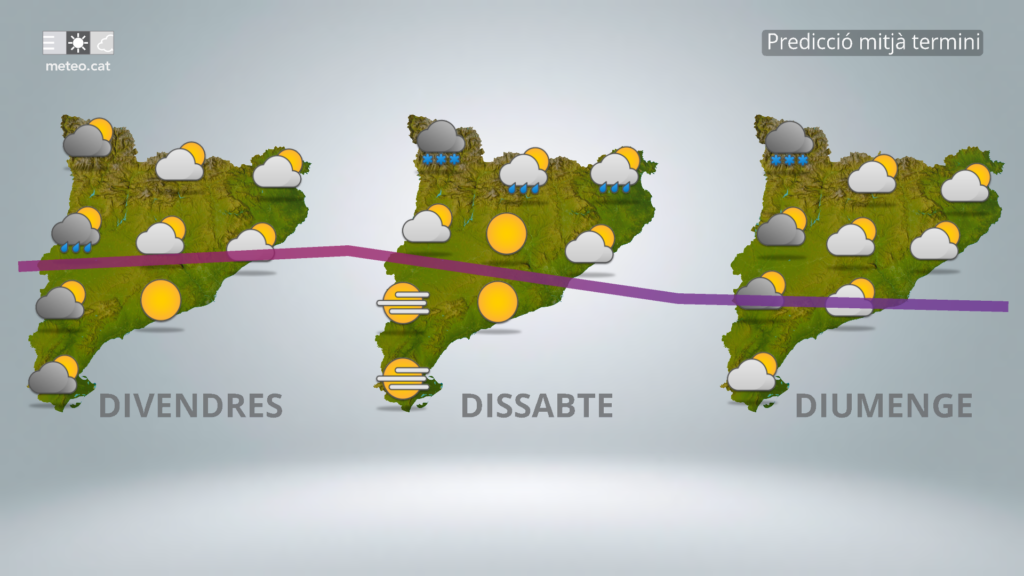 Continuarà el temps canviant, insegur, fins al cap de setmana. Caldrà aprofitar bé les finestres de millora, però estar ben atents i preparats en cas d'empitjorament per boira, pluja o nevada, vent i canvis en la temperatura. Dissabte, encara temps emboirat, nivós i ventós al Pirineu, mentre que diumenge sembla que tindrem una treva que donarà marge arreu.