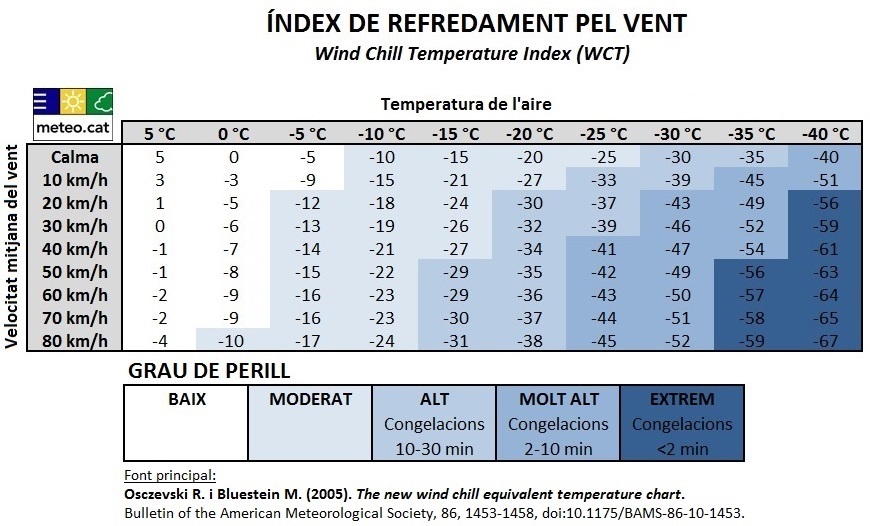 Fent muntanya segur que heu notat com la sensació de fred s’aguditza quan fa vent i tenim part del nostre cos exposat a la intempèrie. Per quantificar aquest efecte sovint s’utilitza l’anomenat WCT (Wind Chill Temperature Index), que ens aproxima al ritme de pèrdua de calor que pot patir el cos humà com a conseqüència de l’efecte combinat d’una temperatura ambient baixa i el vent.
